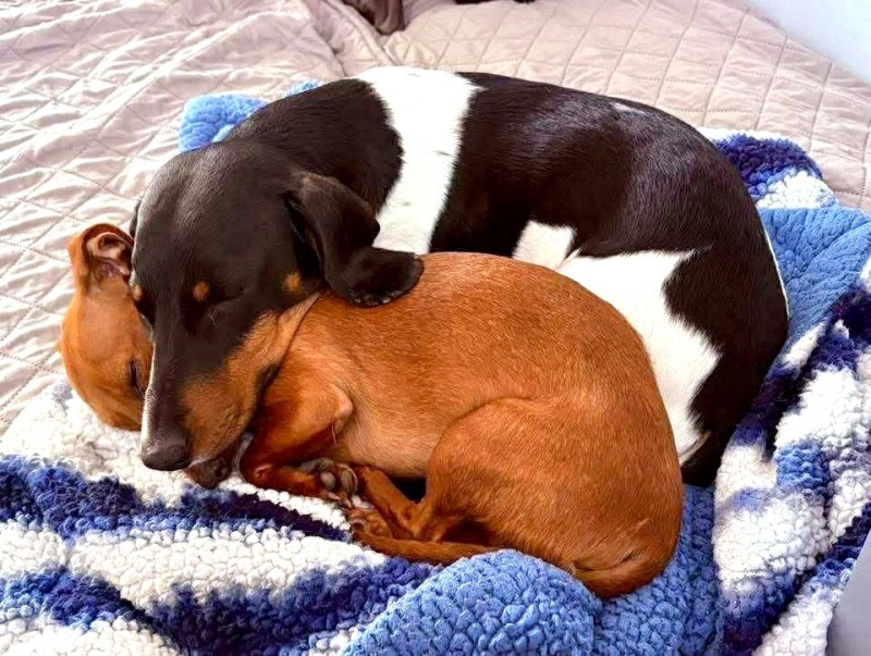 Camber and Static are a bonded pair and MUST be adopted TOGETHER. They just love each other and are always found together either playing or cuddled up. They were surrendered by their owner who could no longer care for them. Camber is a sweet, piebald dachshund boy who loves to play with his toys, fetch a ball and go for walks. He tends to pull when walking on a leash but does listen well to commands. He is housebroken and crate trained. He can be a bit mischievous when left alone, so the home would need to be puppy proofed. Static is a sweet little red dachshund boy who loves to play with his toys, chew on his bones and go for walks on the leash. He is housebroken but can dribble a little when excited. He is crate trained. Camber and Static do bark if someone enters the home or yard but they do calm down once they know there is no threat. They both get along well with other dogs and around people. They would do great in a single family home with a fenced yard where there is usually someone home or they are not left alone for long periods of time. They currently sleep quietly through the night snuggled up together in the crate. However, they would happily love to cuddle up in bed with you. The adoption fee is $275 (per dog so $550 total) and must be willing to travel to Crownsville, MD to meet/adopt Camber and Static. |